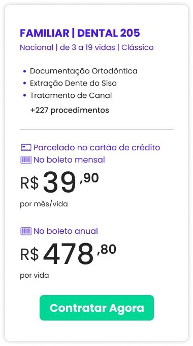 O plano Amil Dental 205 pode ser contratado na modalidade individual, para uma pessoa titular maior de 18 anos ou menor de idade assistido por um responsável legal, ou ainda, na modalidade familiar, para um titular e seus dependentes diretos ou indiretos.